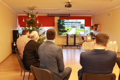 Filiāles viesi sarunājas, iestādes direktors un filiāles vadītāja skatās digitālu prezentāciju