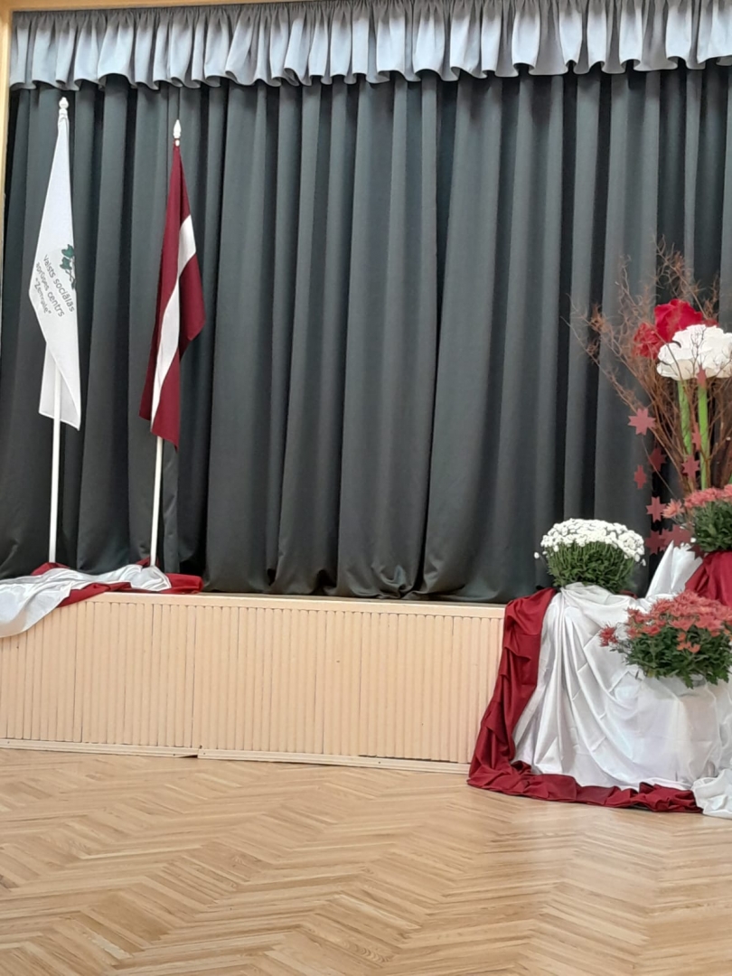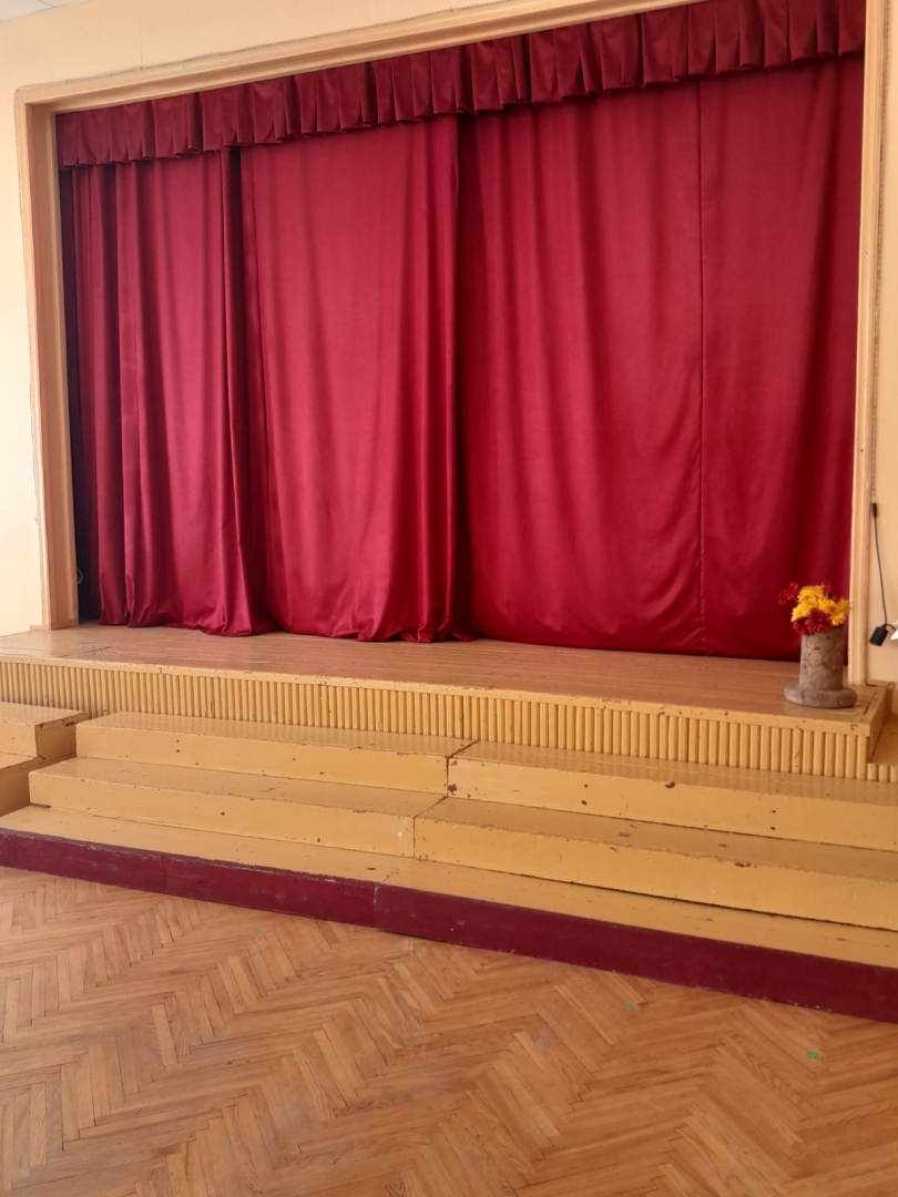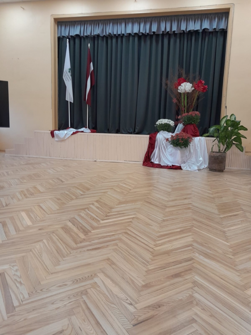 Zālē nomainīti ugunsdroši aizskari, grīdas segums un atjaunota skatuves pakāpieni.