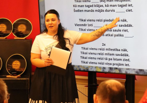Pēc dziesmu minēšanas uzdevumiem dalībniekus ar koncertu iepriecināja viesis Jānis Krūmiņš no grupas Apvedceļš.
