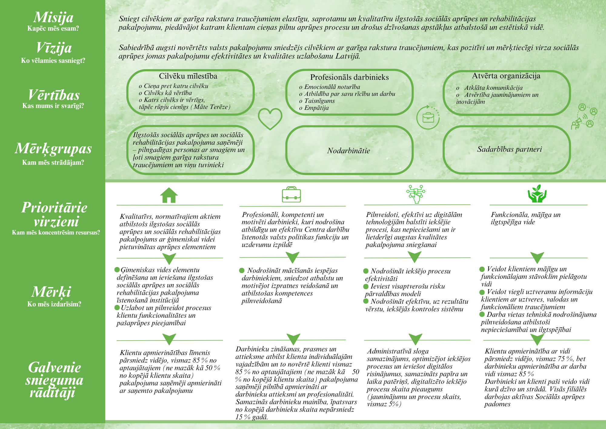 - sniedz cilvēkiem ar garīga rakstura traucējumiem elastīgu, saprotamu un kvalitatīvu ilgstošās sociālās aprūpes un rehabilitācijas pakalpojumu, piedāvājot katram klientam cieņas pilnu aprūpes procesu un drošus dzīvošanas apstākļus atbalstošā un estētiskā vidē.